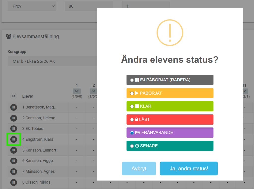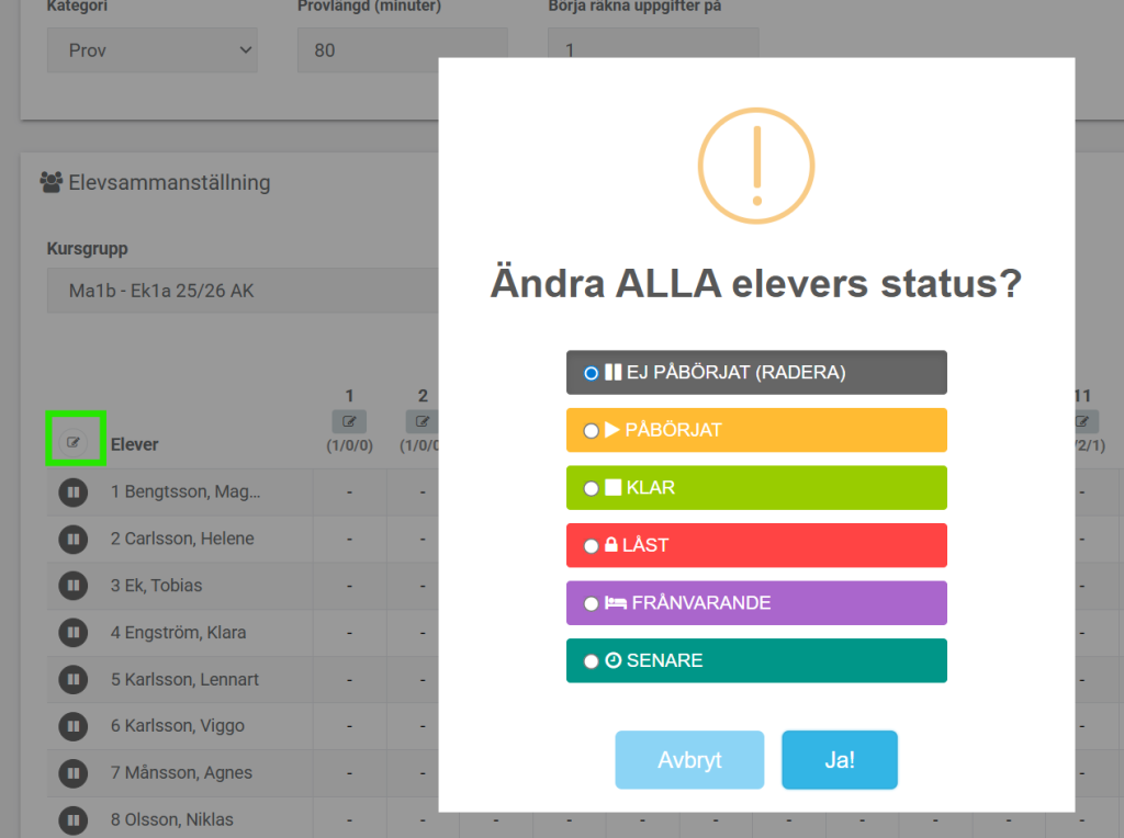 Ändra alla elevers provstatus samtidigt