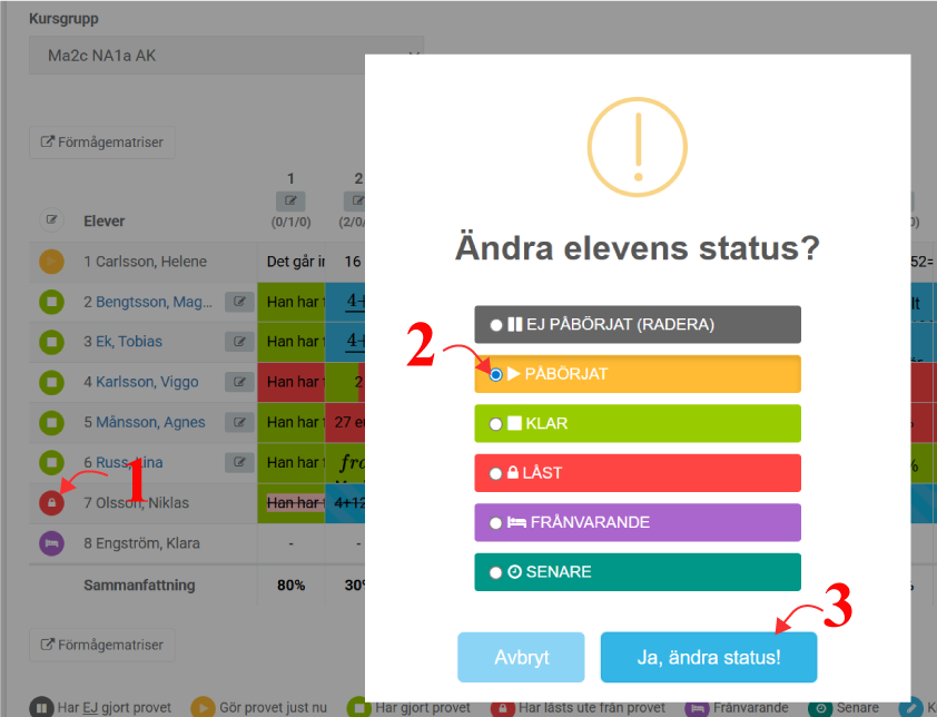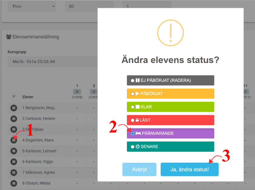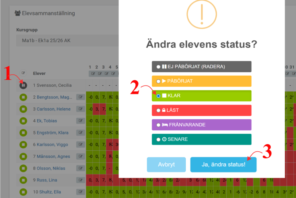 - Klicka på ”status-ikonen” framför elevens namn