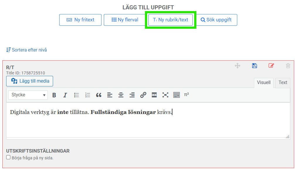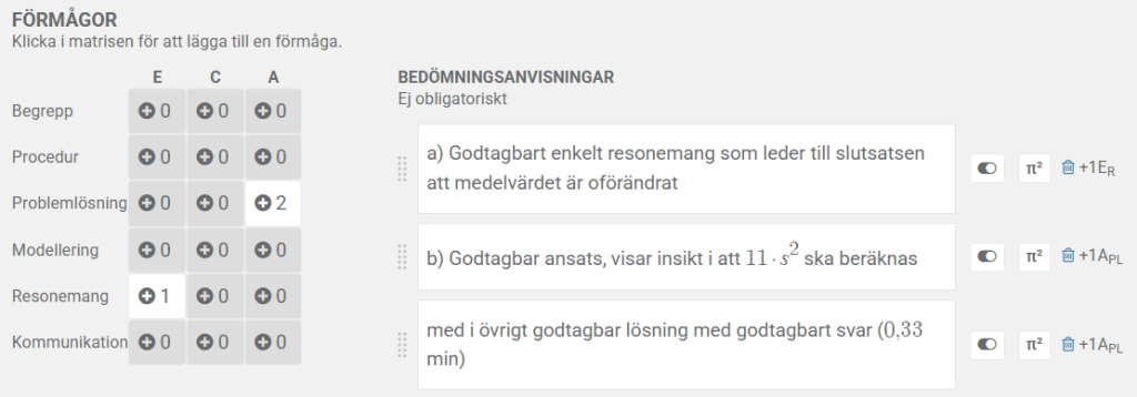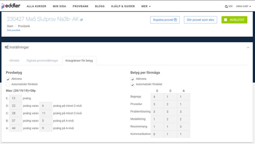 - Aktivera Ett poäng per förmåga under Digitala inställningar i provet för att koppla dina bedömninganvisningar till förmåge- och betygsmatriser.