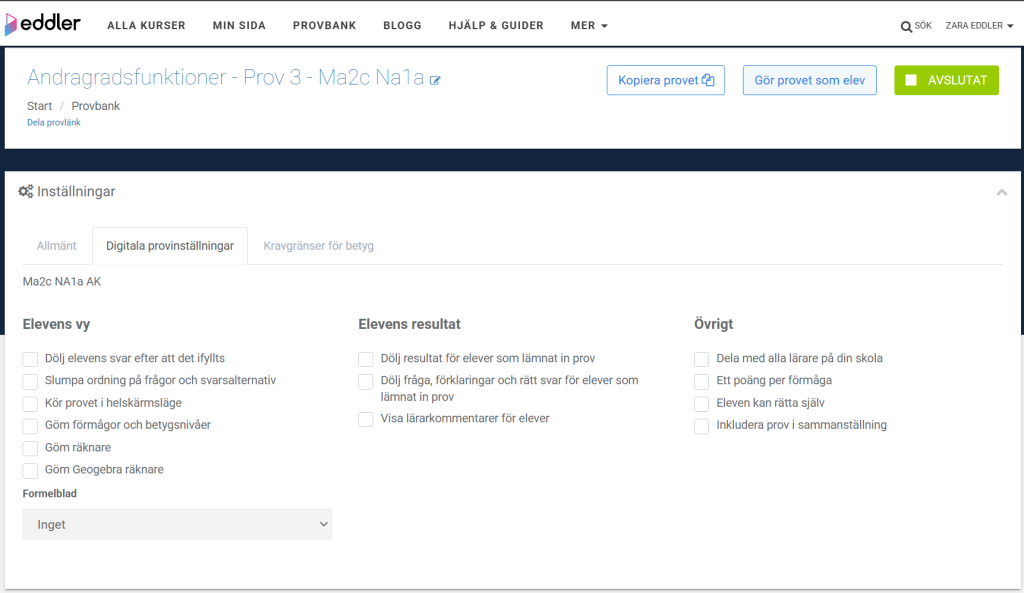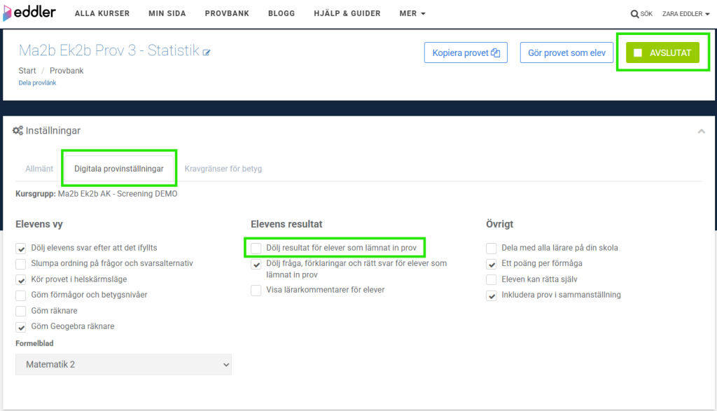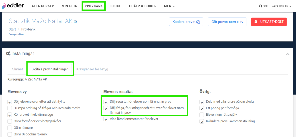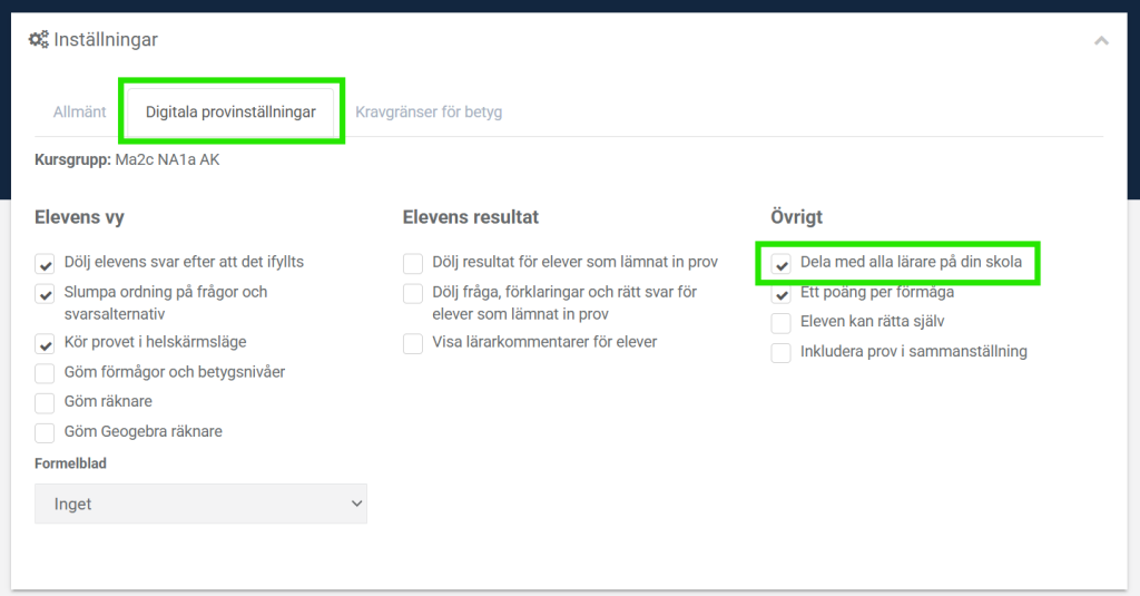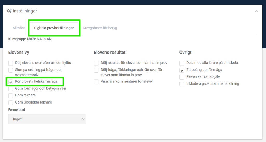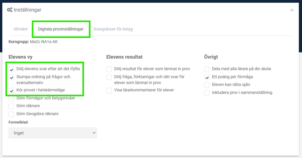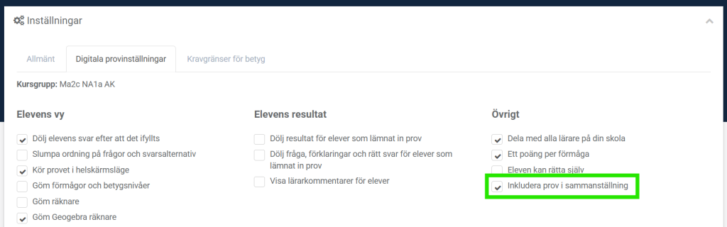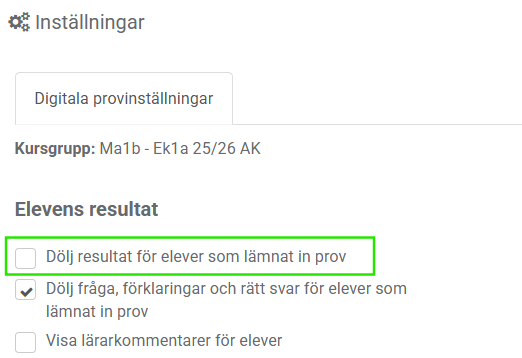 - Checkboxen ”Dölj resultat för elever som lämnat in prov” är avmarkerad.