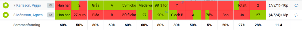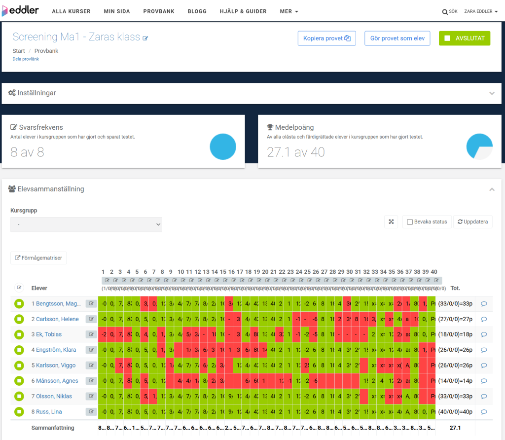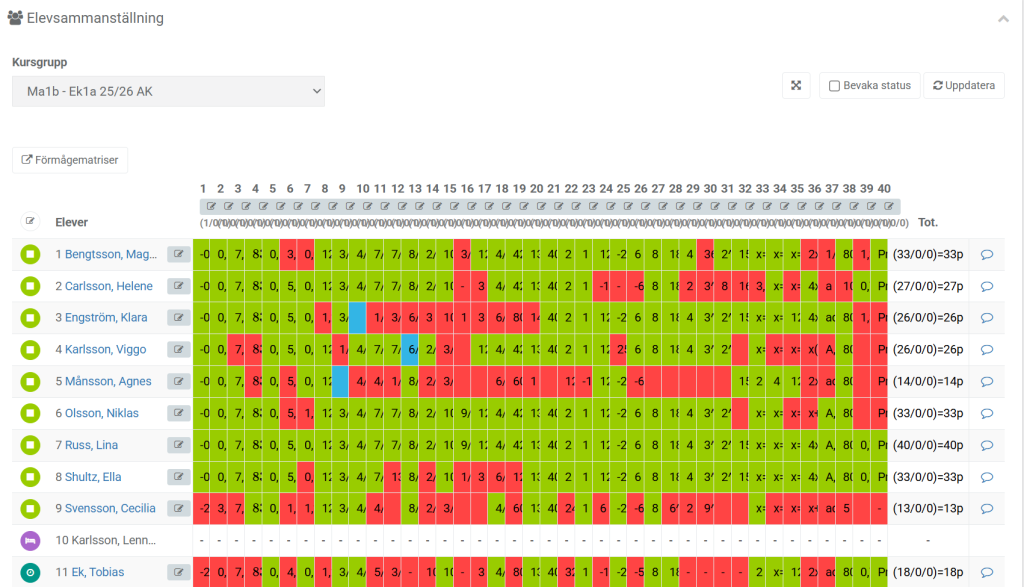Resultatet uppdateras automatiskt i Elevsammanställningen. Totala poängen anges längst till höger för respektive elev.