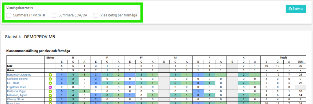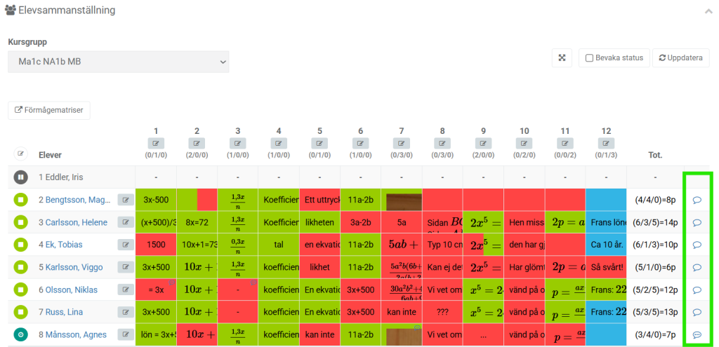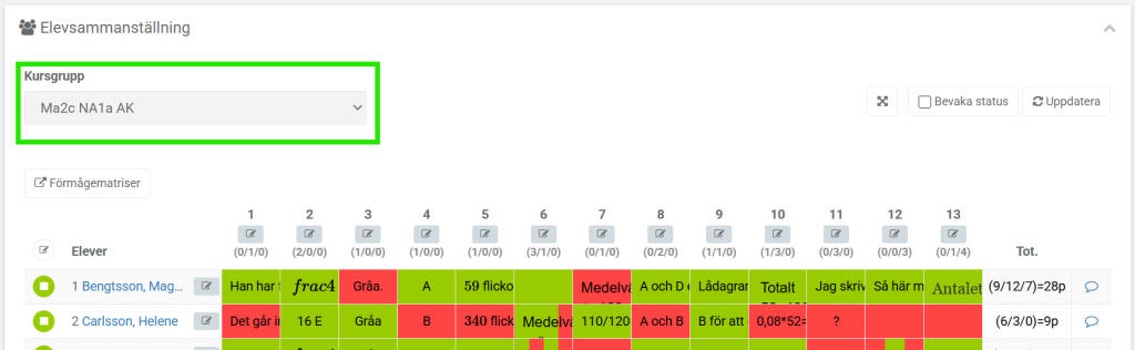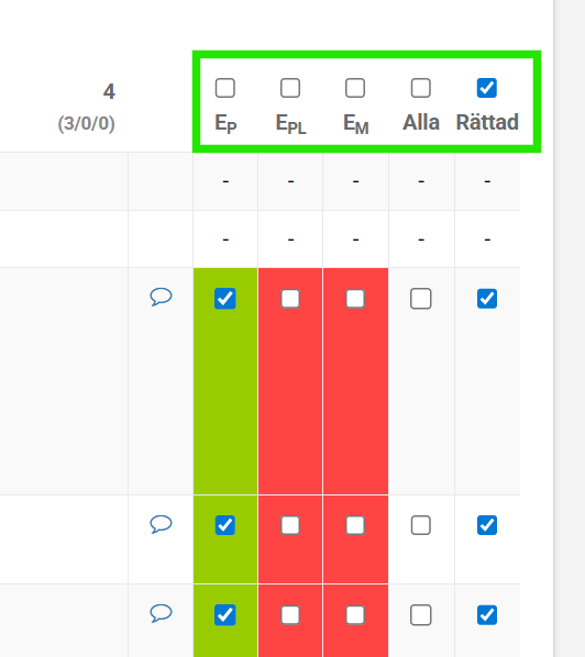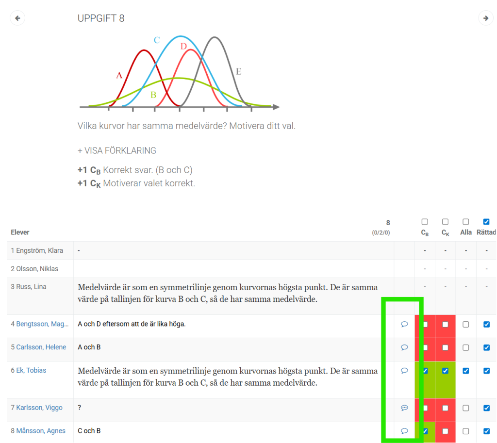 - Klicka i rutan ovanför en förmåga (t.ex. E$_P$ eller C$_M$) för att markera alla elevers svar som rätt eller fel på samma gång.