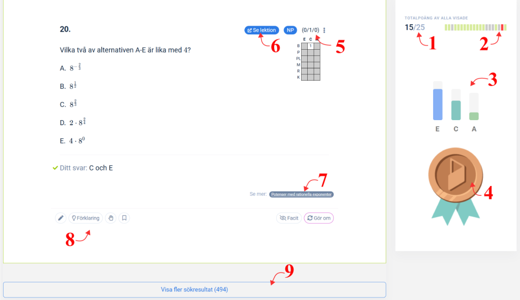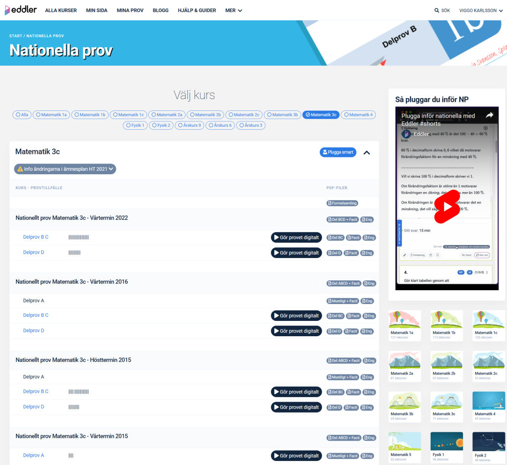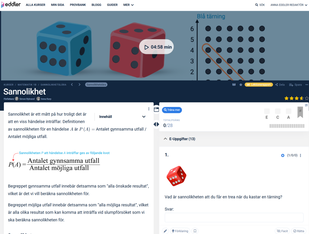 Träna med övningsuppgifter – En avgörande del för att utveckla dina kunskaper är att träna. På Eddler hittar du tusentals uppgifter. Till varje uppgift finns fullständiga förklaringar och bedömningsanvisningar. De flesta rättas automatiskt, men vissa kräver manuell rättning. Titta på bedömningsanvisningarna, särskilt på uppgifter med många poäng, för att säkerställa att du får med allt som krävs för full poäng på prov.