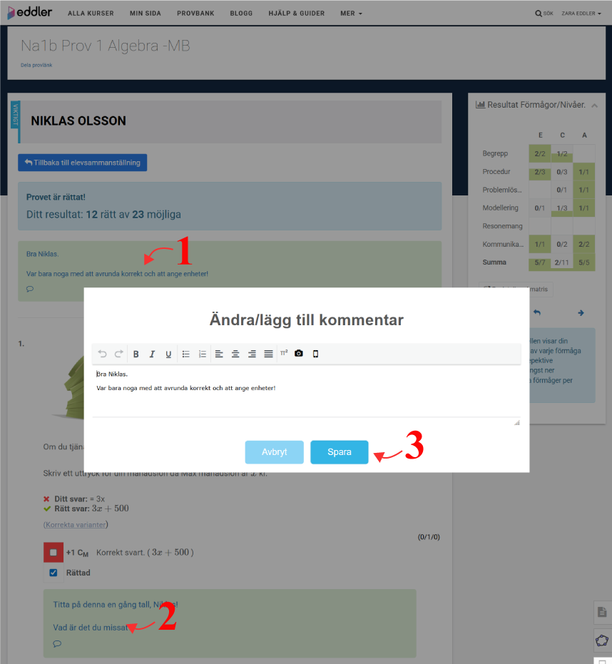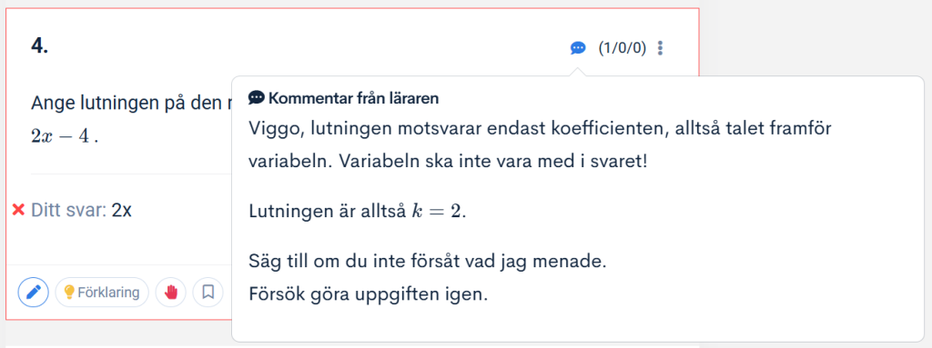 Vid varje uppgift i prov/läxförhör och lektionsövningar kan du som lärare skriva kommentarer till eleven. Du kan välja att göra det på en specifik uppgift eller mer övergripande på ett helt prov eller lektion.