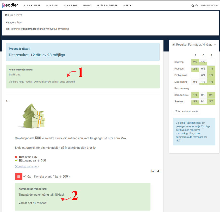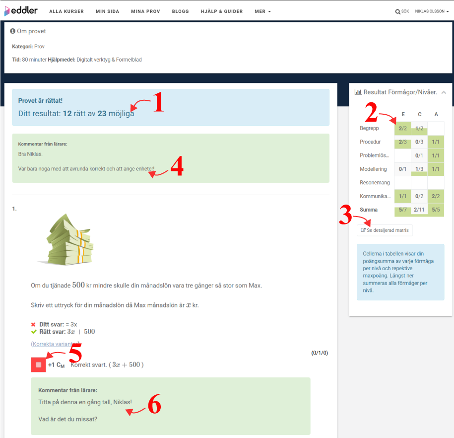 - Efter varje uppgift visas lärarens eventuella kommentarer kopplade till just den uppgiften.