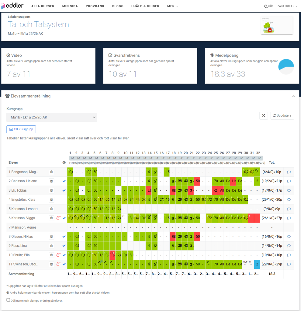 Totala poängen anges längst till höger för respektive elev.