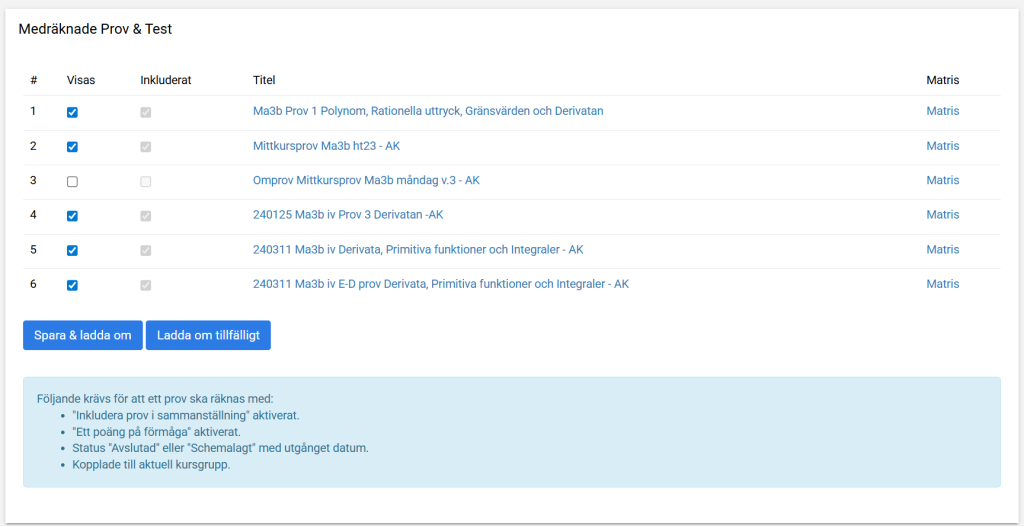 Resultatet uppdateras automatiskt i matrisen till höger om du har valt inställningen Ett poäng per förmåga under Digitala provinställningar.