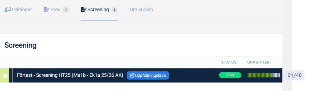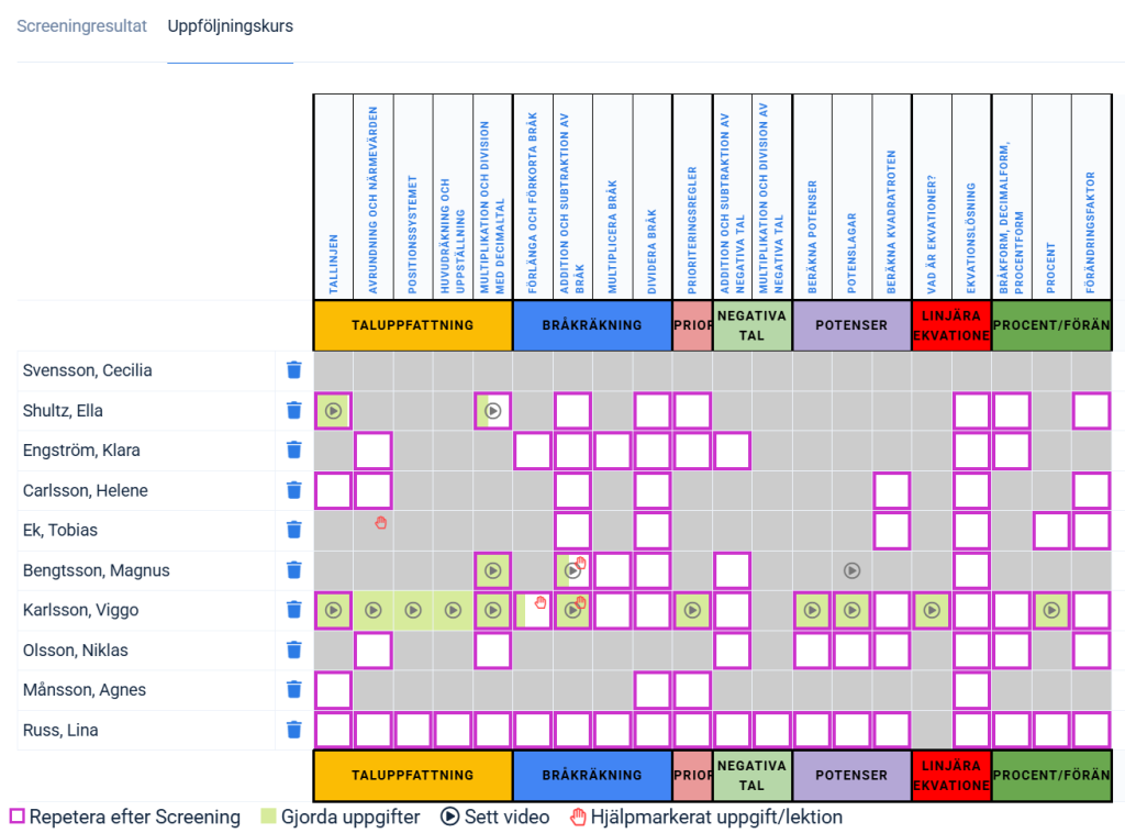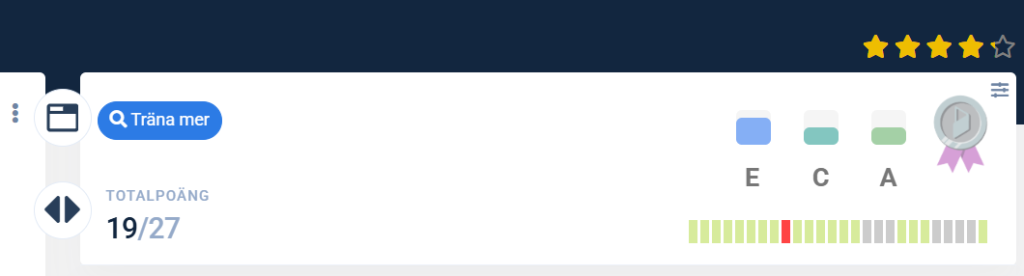 - Personlig kursöversikt som visar progression, övningstyper du behöver tränas mer på, markerade repetitionslektioner och hjälpbehov