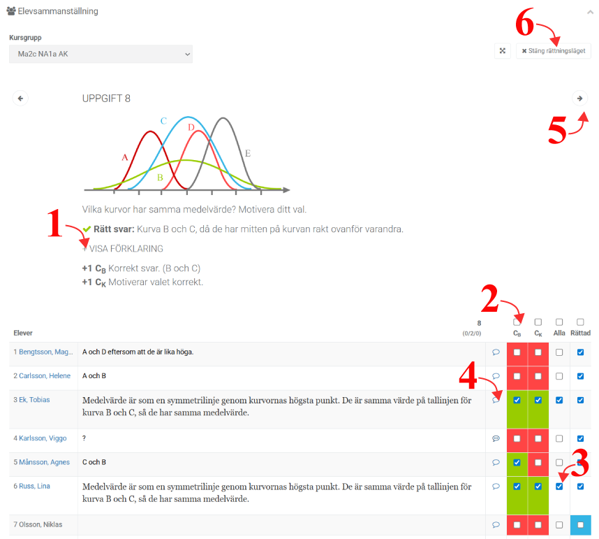 - Klicka på efter elevens namn för att öppna rättningsläget – En elev i taget.