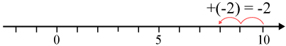 Vi kan på tallinjen illustrera detta som att vi utgår från talet $10$10. Att addera $-2$2 är detsamma som att subtrahera med $2$2 vilket innebär att vi förflyttar oss två steg åt vänster på tallinjen.