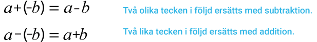 Subtraktion av ett negativt tal ersätts med addition av det motsatta talet. Det leder till att lika tecken i följd ersätts med addition (+).