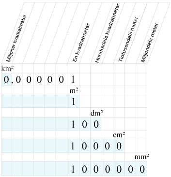 Alltså gäller att $1$1 m$^2$2 $=100$=100 dm$^2=10\text{ }000$2=10 000 cm$^2=1\text{ }000\text{ }000$2=1 000 000 mm$^2$2.