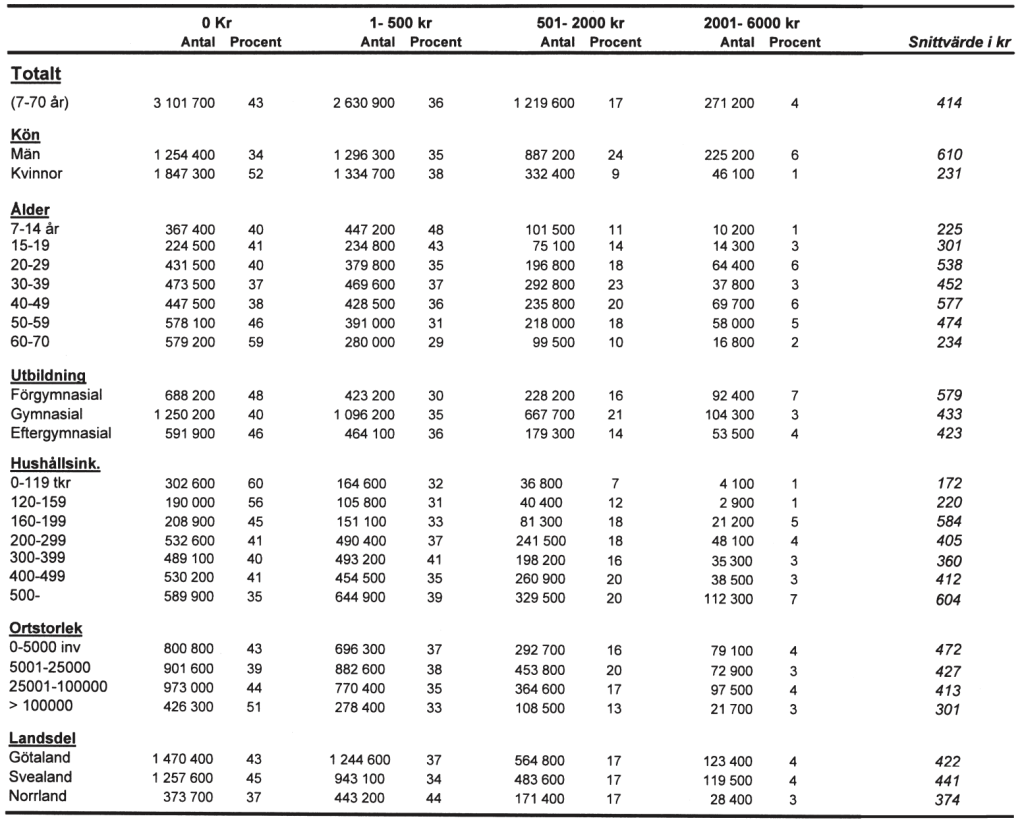 Antal och andel personer i Sverige i åldrarna 7–70 år som spenderade 0 till 6 000 kronor på att se på idrott under 2003. Materialet är uppdelat efter spenderat belopp samt efter kön, ålder, utbildning, hushållsinkomst, ortstorlek och landsdel. Därutöver redovisas den genomsnittliga spenderade summan per person (snittvärde) för respektive grupp.