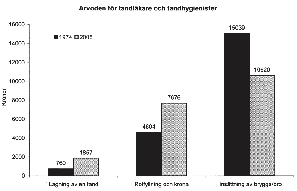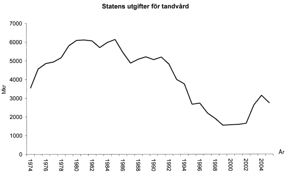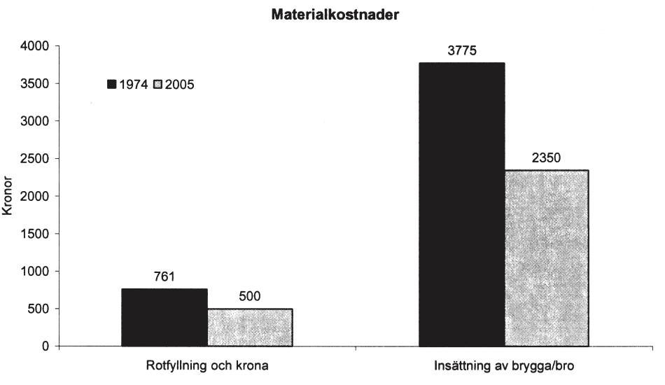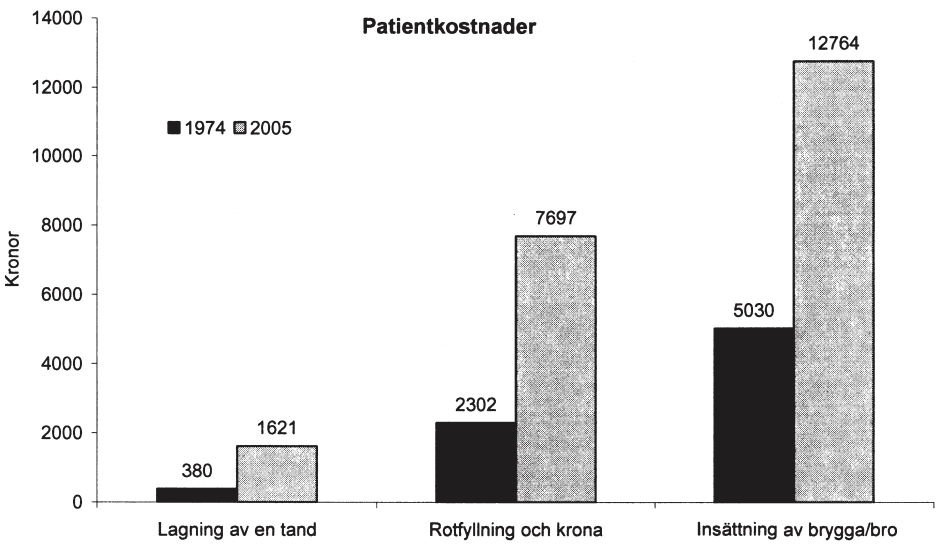 Statens utgifter för tandvård, i miljoner kronor, 1974–2005. Patientkostnader respektive tandläkar- och tandhygienistarvoden för tre olika behandlingar 1974 och 2005. Därutöver redovisas materialkostnader 1974 och 2005 för två olika behandlingar. Samtliga kostnader är omräknade i 2005 års penningvärde.