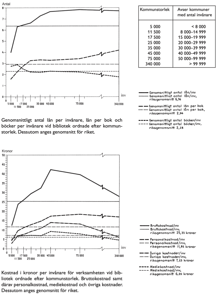 Hur stor var skillnaden mellan en kommun av minsta storleken och en kommun av största storleken vad gäller bruttokostnaden per invånare för bibliotekens verksamhet?