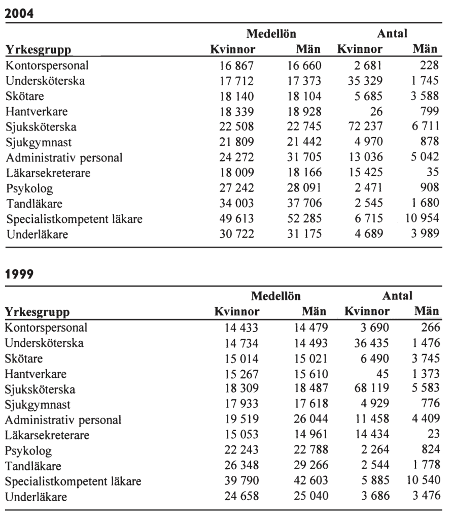 Genomsnittlig månadslön (medellön) för kvinnor och män inom vissa yrkesgrupper 2004 respektive 1999. Dessutom anges antalet anställda kvinnor och män i respektive yrkesgrupp.