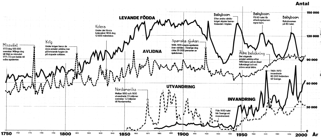 Antalet levande födda och avlidna samt antalet ut- och invandrare under perioden 1750–2004. Därutöver anges olika händelser som påverkat befolkningsutvecklingen.