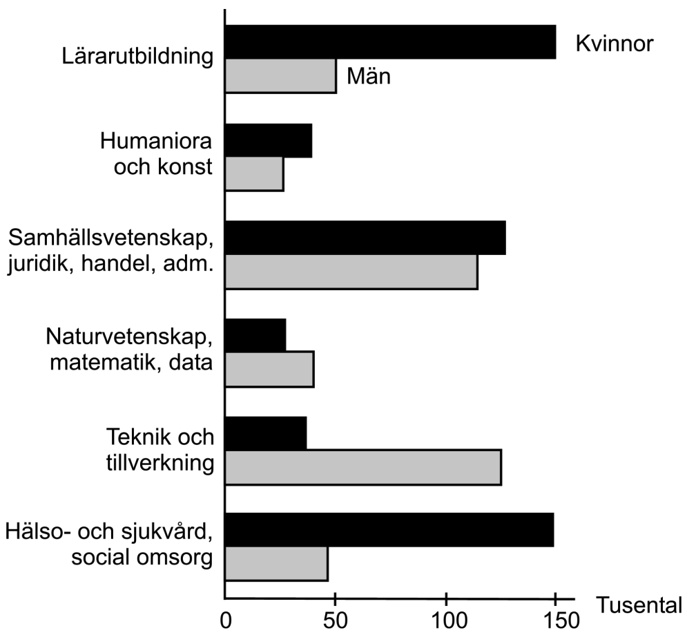 Antalet högutbildade¹ svenskar 25–64 år, fördelat på utbildningsinriktning och kön, 2006.