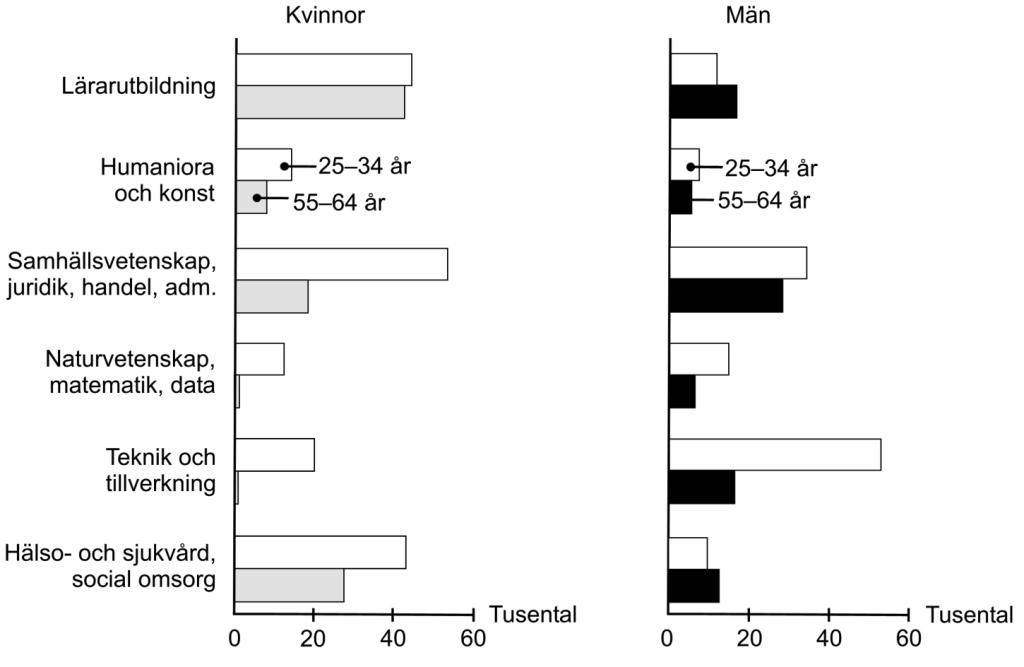 Antalet högutbildade¹ svenskar i åldersgrupperna 25–34 år och 55–64 år, fördelat på utbildningsinriktning och kön, 2006.