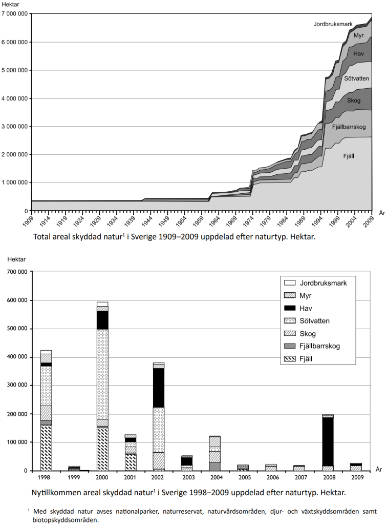 Hur stor var arealen skyddat fjäll $2009$2009 jämfört med $100$100 år tidigare?