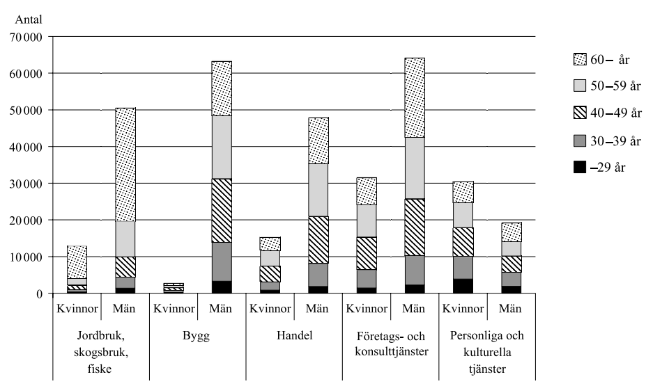 Studera den stapel i branschen Handel som redovisar antalet företag med män som företagsledare. En åttondel av denna stapel utgörs av företag med en företagsledare i en viss åldersgrupp. Vilken åldersgrupp?