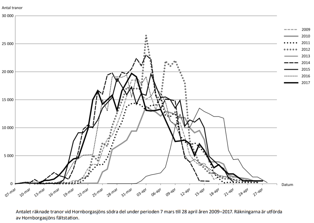 Identifiera den enskilda dag då antalet tranor var som störst. Hur många fler var tranorna denna dag jämfört med samma datum tre år tidigare?