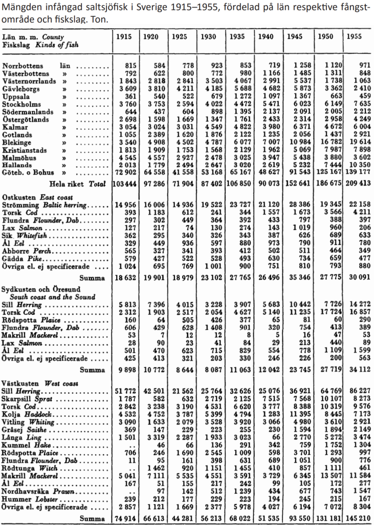 Kurvan nedan visar mängden infångad saltsjöfisk i ett av länen $1920-1950$1920−1950. Vilket län?