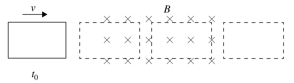 En rektangulär metallslinga dras genom ett avgränsat magnetfält $B$B från vänster till höger med konstant fart $v$v . Bilderna nedan visar slingans placering vid några olika tidpunkter.