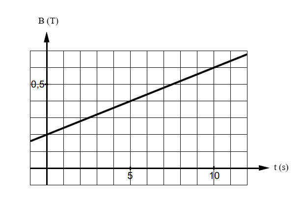En kvadratisk slinga med två varv har sidan $0,05$0,05 m. Den befinner sig i ett homogent magnetfält som är vinkelrätt mot slingans plan. Den magnetiska flödestätheten $B$B ökar med tiden $t$t enligt diagrammet.
