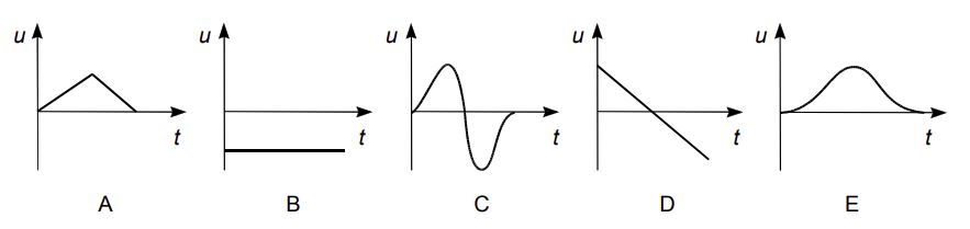 När en stavmagnet faller genom en spole induceras en spänning över spolen. Vilken av följande grafer visar bäst den inducerade spänningen som funktion av tiden? Öva på att motivera ditt svar.