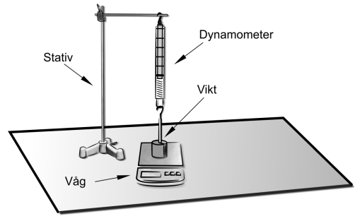 vågens utslag då vikten belastar både vågen och dynamometern.Utrustning: