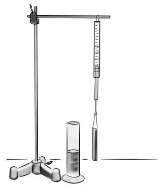• Häng metallstaven i dynamometern och sänk den stegvis ner i vattnet.
