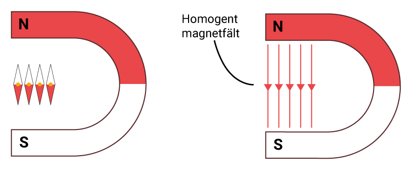 En annan vanlig typ av magnet är en så kallad hästskomagnet eller U-magnet. Den är formad som en hästsko (eller ett U) med nordänden och sydänden längst ut på bladen/skänklarna. Om vi lägger kompassnålar vid magneten ser vi återigen att magnetfältets riktning är ut från nordänden och in till sydänden. Mellan skänklarna finns ett i princip homogent magnetfält.