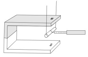En kopparstav med längden $3,0$3,0 cm är upphängd i två tunna koppartrådar så att den hänger i gapet till en permanentmagnet. Om en ström med styrkan $5,0$5,0 A sänds genom kopparstaven kan denna hållas i sitt läge med hjälp av en dynamometer som då visar $0,12$0,12 N.