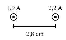 Två parallella ledare med längden $75$75 cm placeras på avståndet $2,8$2,8 cm från varandra. Ström sänds åt samma håll genom respektive ledare. Med hur stor kraft påverkar då ledarna varandra? Svara med enheten μN (mikronewton).