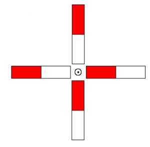 Fyra likadana stavmagneter är symmetriskt placerade kring en strömförande ledare, enligt figuren. Ledaren påverkas då av en magnetisk kraft. Bestäm kraftens riktning.