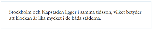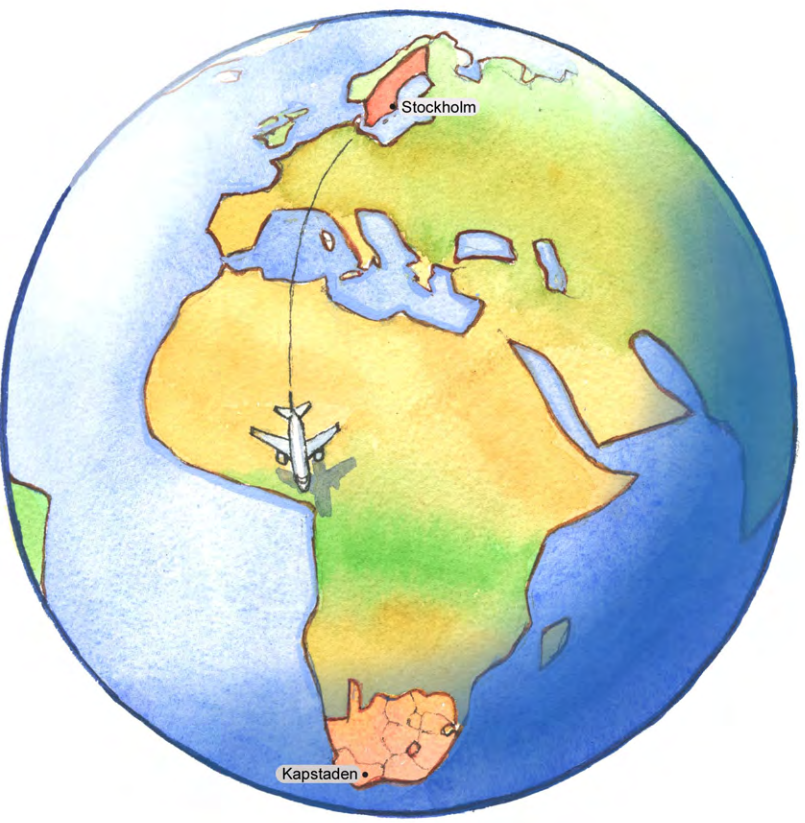 Kevin och Veronica reser från Stockholm till Kapstaden. Resan startar kl. $17.25$17.25 och de är framme kl. $12.55$12.55 dagen efter. Hur lång tid tar resan?