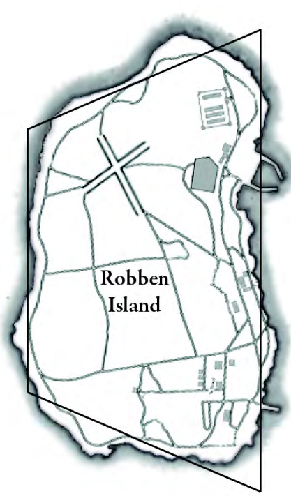 Robben Island är en känd fängelseö utanför Kapstaden. Formen på ön kan liknas vid en parallelltrapets. Läs av kartan och beräkna ungefär hur stor area Robben Island har i verkligheten.
