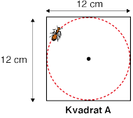 Figurerna är inte skalenligt ritade.a) I kvadrat $A$A med sidan $12$12 cm ritas en cirkel med diametern $12$12 cm. Myran promenerar hela vägen runt cirkeln. Hur långt har myran då gått?