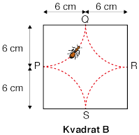 b) I kvadrat $B$B med sidan $12$12 cm ritas fyra cirkelbågar med samma radie. Cirkelbågarnas medelpunkter ligger i kvadratens hörn. Myran promenerar längs cirkelbågarna. Den startar i punkt $P$P och går till $Q$Q vidare till $R$R och $S$S och sedan till $P$P igen. Jämför längden på myrans promenad i kvadrat $B$B med promenaden i kvadrat $A$A. Förklara ditt resultat.