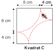 c) I kvadrat $C$C med sidan $12$12 cm ritas fyra andra cirkelbågar, två med radien $4$4 cm och två med radien $8$8 cm. Myran promenerar längs alla fyra cirkelbågarna. Jämför längden på myrans promenad i kvadrat $C$C med promenaden i kvadrat $B$B. Förklara ditt resultat.