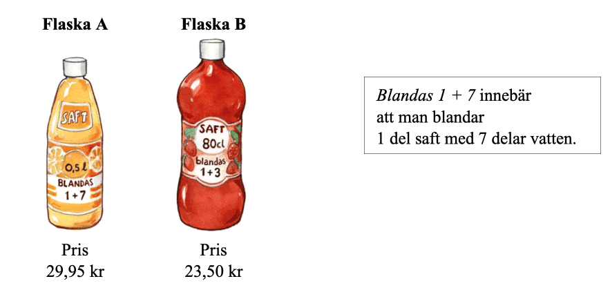 Saften ska blandas med vatten. Texten på flaskorna talar om hur många delar saft och vatten som ska blandas.