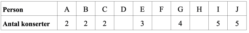 Tio vänner besökte en festival. Tabellen visar hur många konserter som var och en av vännerna var på. Det saknas uppgifter i tabellen för tre av vännerna.