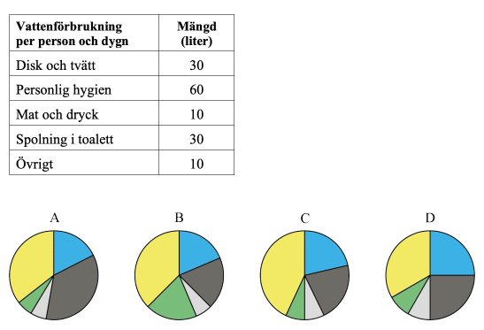 Tabellen visar medelvärdet för hur mycket vatten en person i Sverige förbrukar per dygn. Vilket diagram stämmer med informationen i tabellen? Motivera ditt svar.