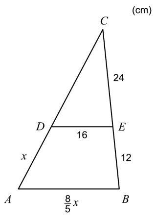 I triangeln $ABC$ABC är sträckan $DE$DE parallell med sidan $AB$AB. Se figur.