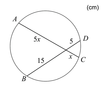 Figuren visar en cirkel med två kordor $AC$AC och $BD$BD som går genom en gemensam punkt och där delsträckornas längder är angivna.