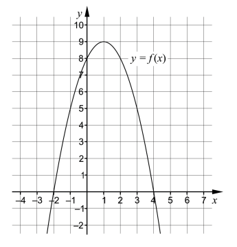 Grafen till en andragradsfunktion $f$f har sitt ena nollställe i $x=3$x=3 och sitt maximum i punkten $(0,\,18)$(0, 18).