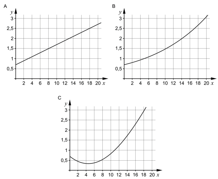 Graferna A, B och C visar tre olika tänkbara modeller för bostadsrättens värdeutveckling där $y$y är bostadsrättens värde i miljoner kr och $x$x är tiden i år efter januari år 2000.