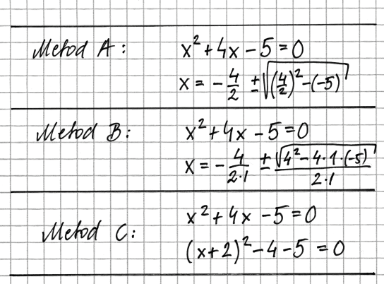 Figuren visar tre påbörjade algebraiska lösningar av ekvationen $x^2+4x-5=0$x2+4x5=0.
