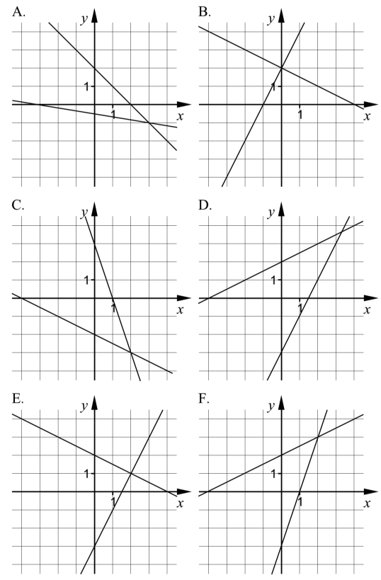 Ett av koordinatsystemen A–F visar ekvationssystemet $ \begin{cases} y=-\frac{1}{2}x+2 \\ y=2x-3 \end{cases} $